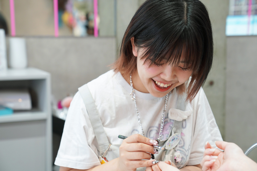 KIRI:VENUS BELTのネイリストが、SNSで個性のあるデザインを発信していて、一人ひとりの“好き”が尊重されているのを感じました。ここなら、自分の感性を大切にしながら技術を活かせると思いましたし、スタッフの仲の良さやサロンの雰囲気にも惹かれたんです。常にトレンドを意識したデザインが多い点も、自分自身が成長できる環境だと感じ、「ここで働きたい」と思いました。