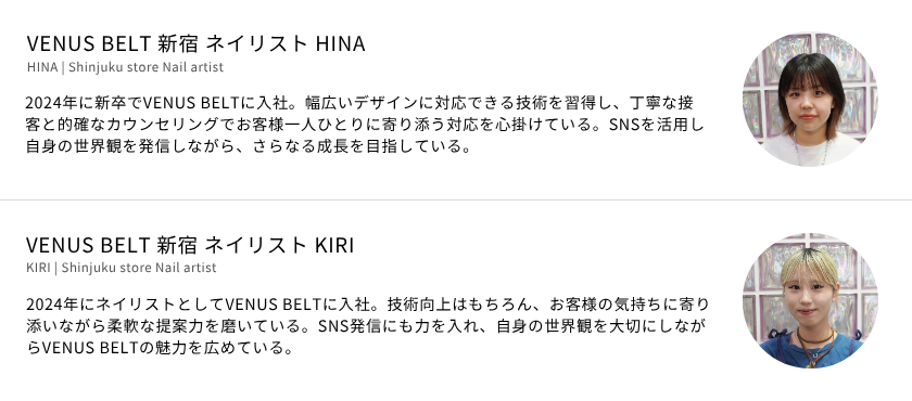 HINA:なかなか自分に合うサロンが見つからず悩んでいたときに、友人から紹介されたのがきっかけです。実際にVENUS BELTのインスタグラムを見てみると、トレンド感のあるデザインや投稿が多く、ブランドとしての感度の高さを感じました。流行を取り入れたネイルやまつげのデザインに惹かれ、「ここなら自分も成長できる」と思い、入社を決めました。