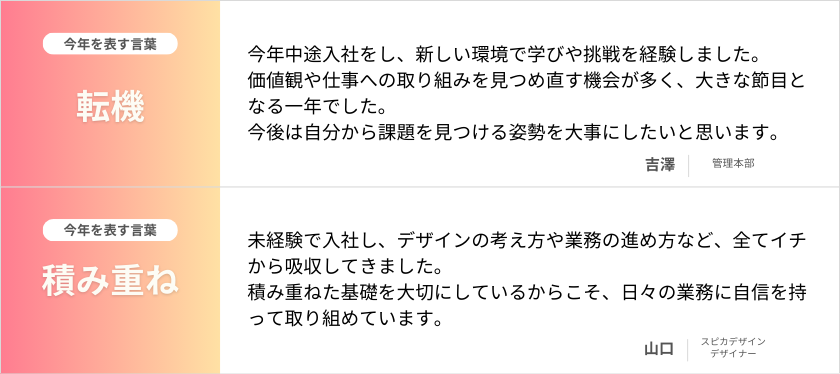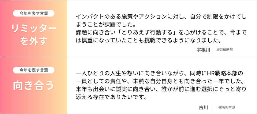 角田(広報):2025年はホールディングス化もあり、さまざまな変化を感じた一年だったと、私自身感じています。みなさんにとってはどんな一年でしたか。ぜひ、「今年を表す一言」とあわせて感想をお願いします。
