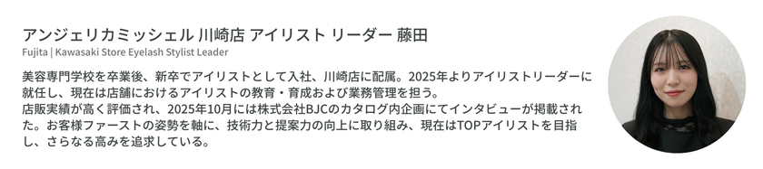 その第一弾として、アンジェリカミッシェル川崎店のアイリスト・藤田みくにさんにお話を伺いました。