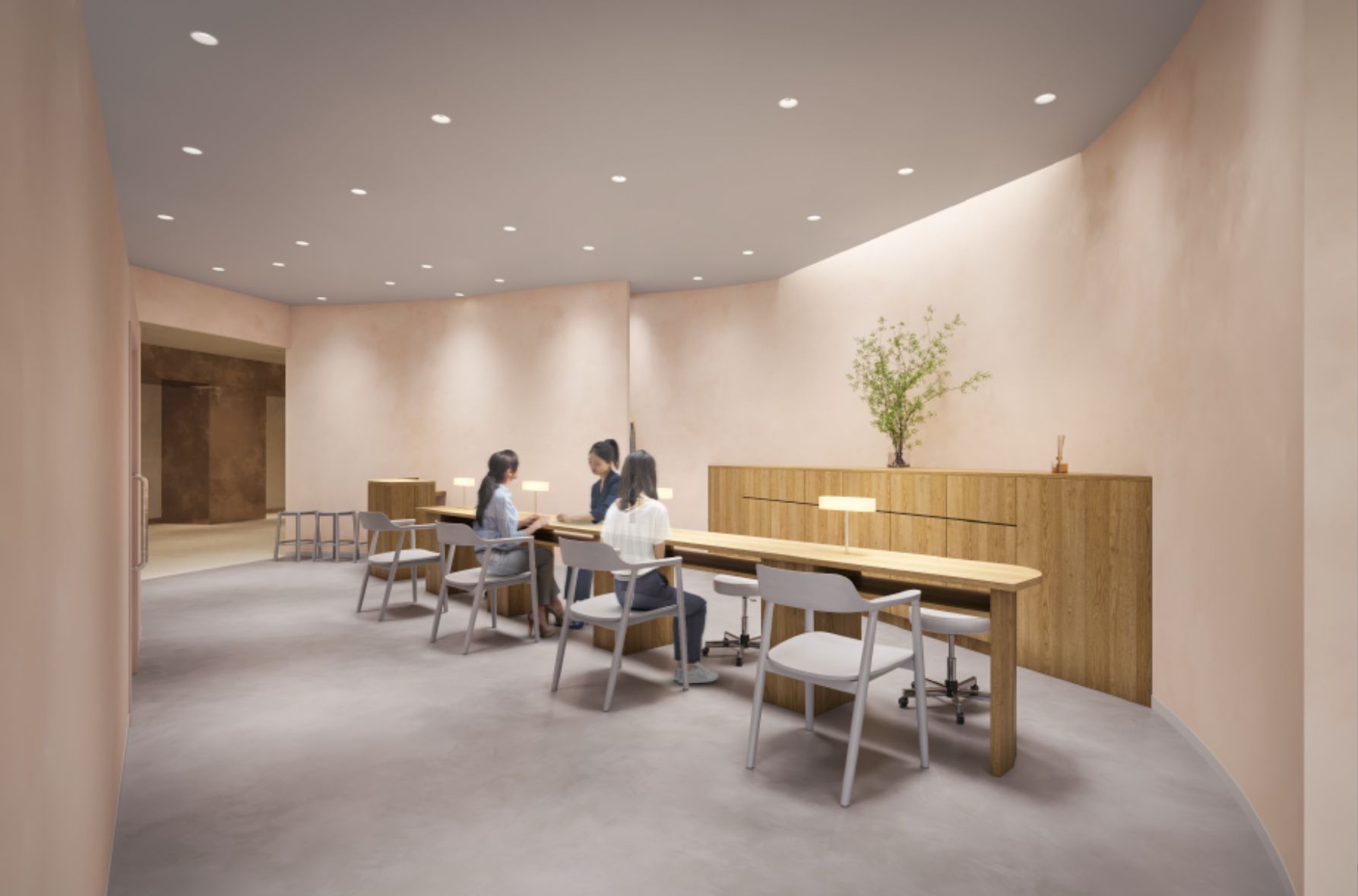 店内は、大きな窓から自然光がたっぷりと差し込む、開放感のある空間となっています。素材感のある壁や曲線を描く壁面がやわらかな光に包まれ、時間とともに表情を変化させます。入口から続くロングテーブルのネイルエリアは、木の温もりを感じるデザインでゆったりとお過ごしいただけます。